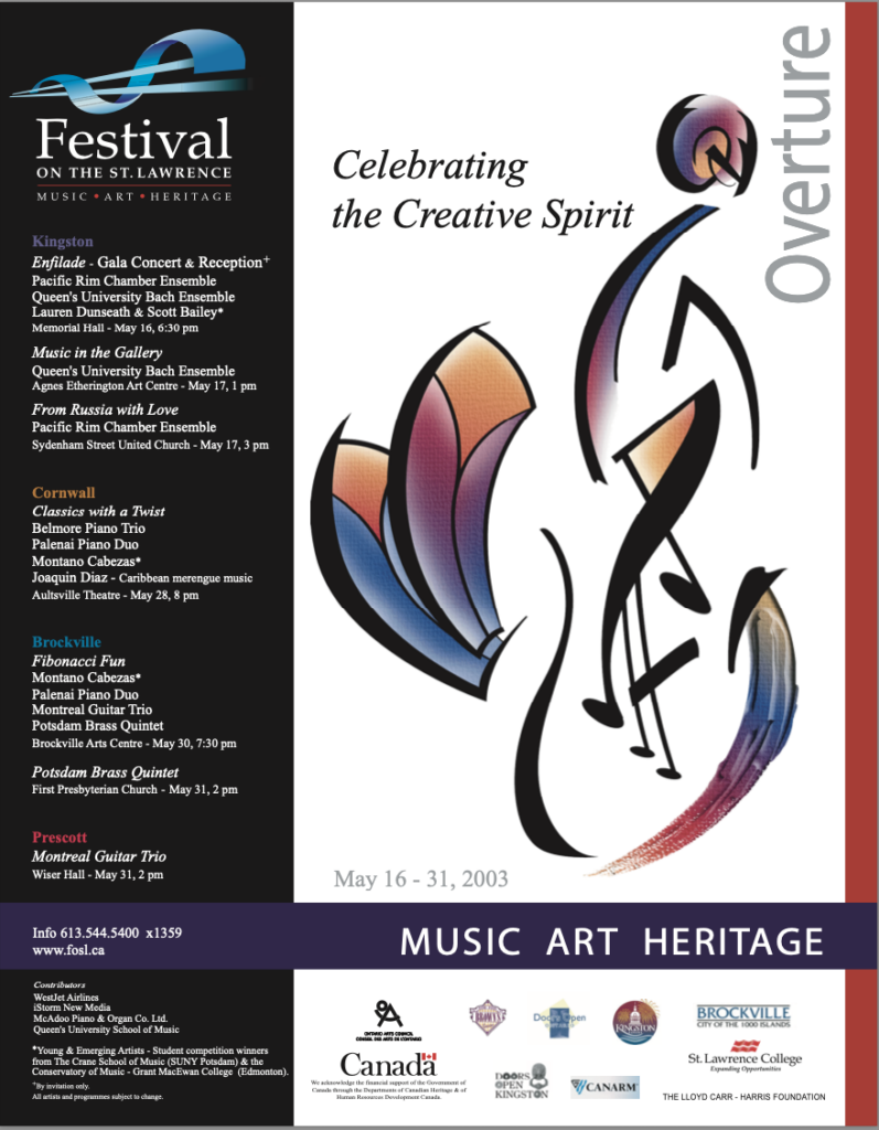Festival on the St Lawrence was sponsored by Human Resources Canada and St. Lawrence College in Kingston. As Administrative Directors, Joy and Adrienne produced concerts in communities along the St. Lawrence Seaway and initated a Young and Emerging Artist program.